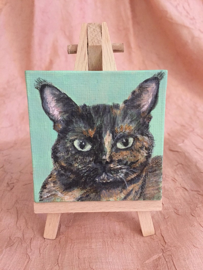 Shaney James, Lakewood, Ohio. Pet Portraiture Miniature, Acrylic on Canvas, 2 3/4″ X 2 3/4″. Includes easel. Commissions delightfully accepted! $47 Feline love of my life for nearly 17 years! He found me through my dear friend Janie. I miss them both.
