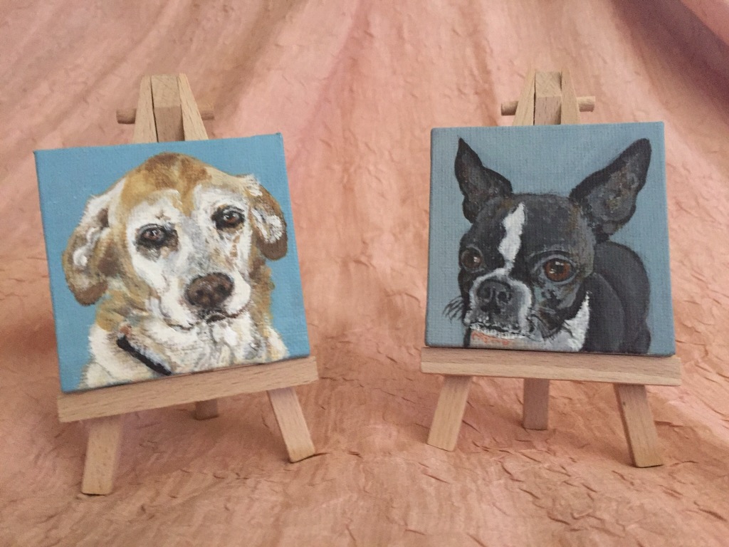 Lady and Izzy, Seal Beach, CA. Pet Portrait Miniatures. Acrylic on Canvas, 2 3/4″ X 2 3/4″. Includes easel. Displays created by Kimberly B. Gray for the upcoming 2017 Eldorado Studio Art Tour, May 20-21. Commissions delightfully accepted!  $47