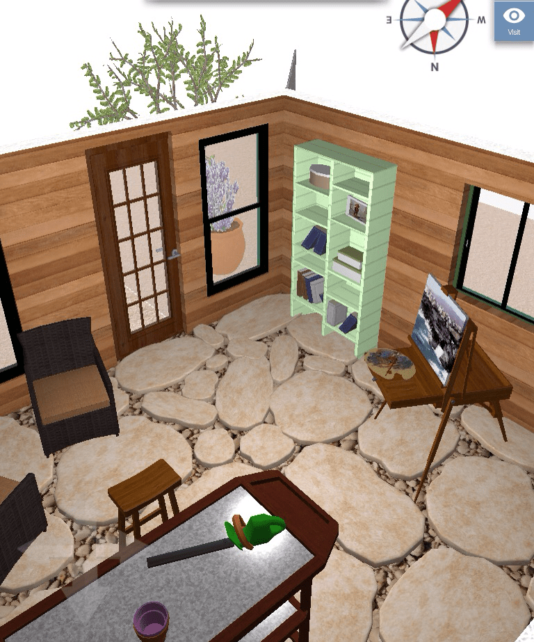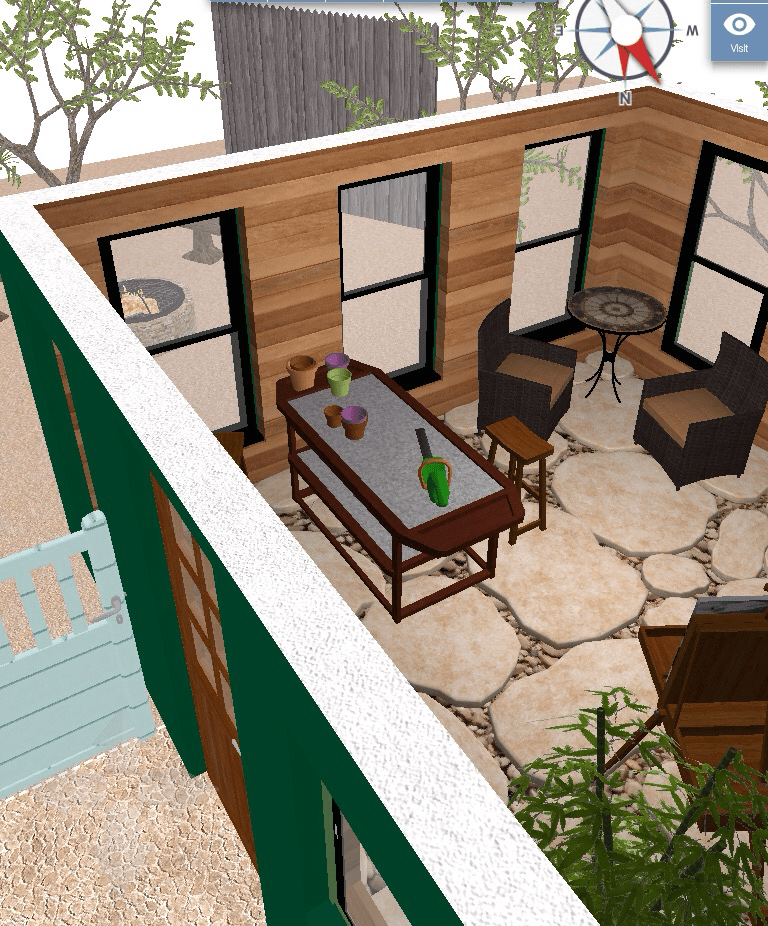 This is the second post showing two 3D screenshots of a greenhouse renovation. This renovated structure is detached from the residence and will function as a sunroom, potting shed, and artist’s atelier.