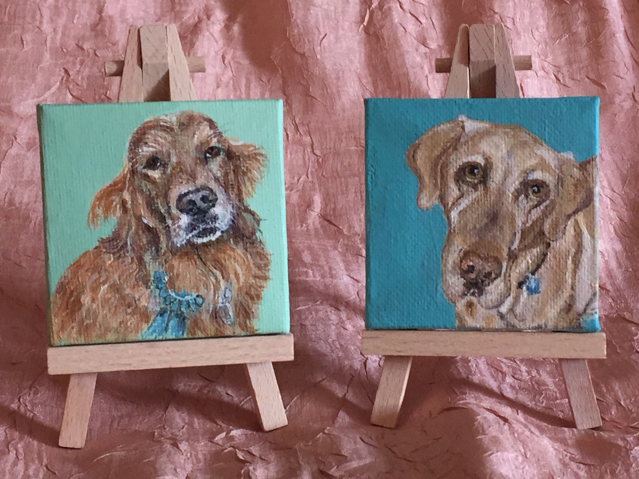 Formerly of Massachusetts, these two puppers are now living in Santa Fe. Their human, Donna, asked me to render these miniatures (acrylic on canvas) with easels. Love their faces!