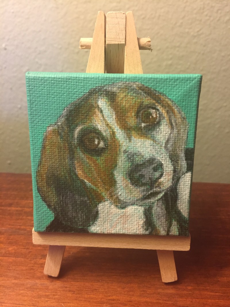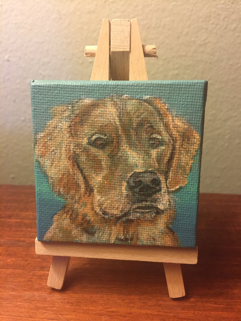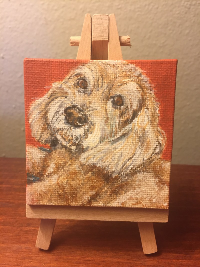 This is Molly from Boston! Acrylic on canvas, 2 3/4″ x 2 3/4″, includes easel, UV protectant applied. Kimberly B. Gray, Santa Fe, NM, 2018.