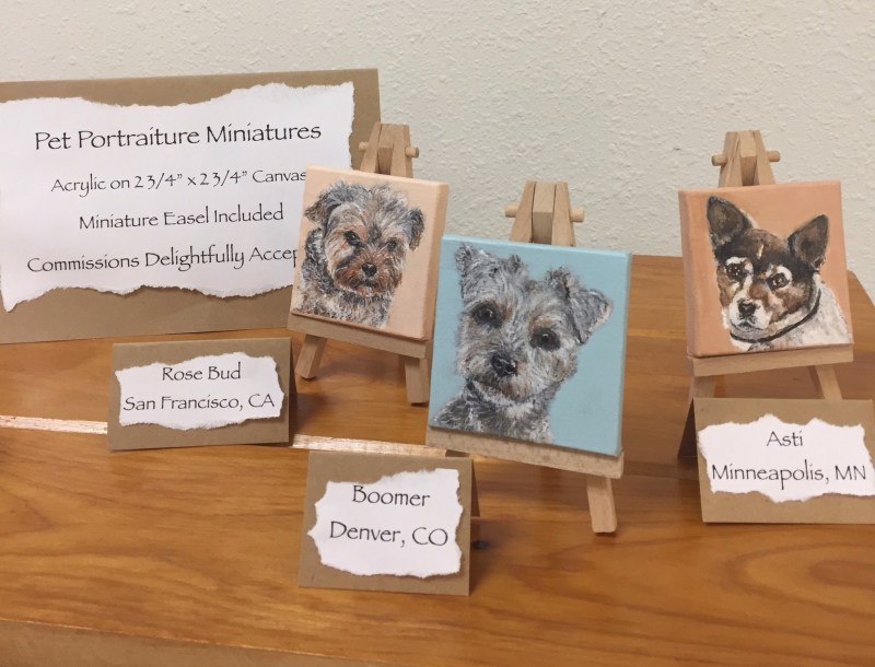 Acrylic on canvas, measuring approximately 3″x3″, easel included, finished with a UV protectant. These miniatures have been rendered by me from sea to shining sea and parts in between! Commissions have been delightfully accepted. Thank you to all the pets’ humans for having me create these small works of art!