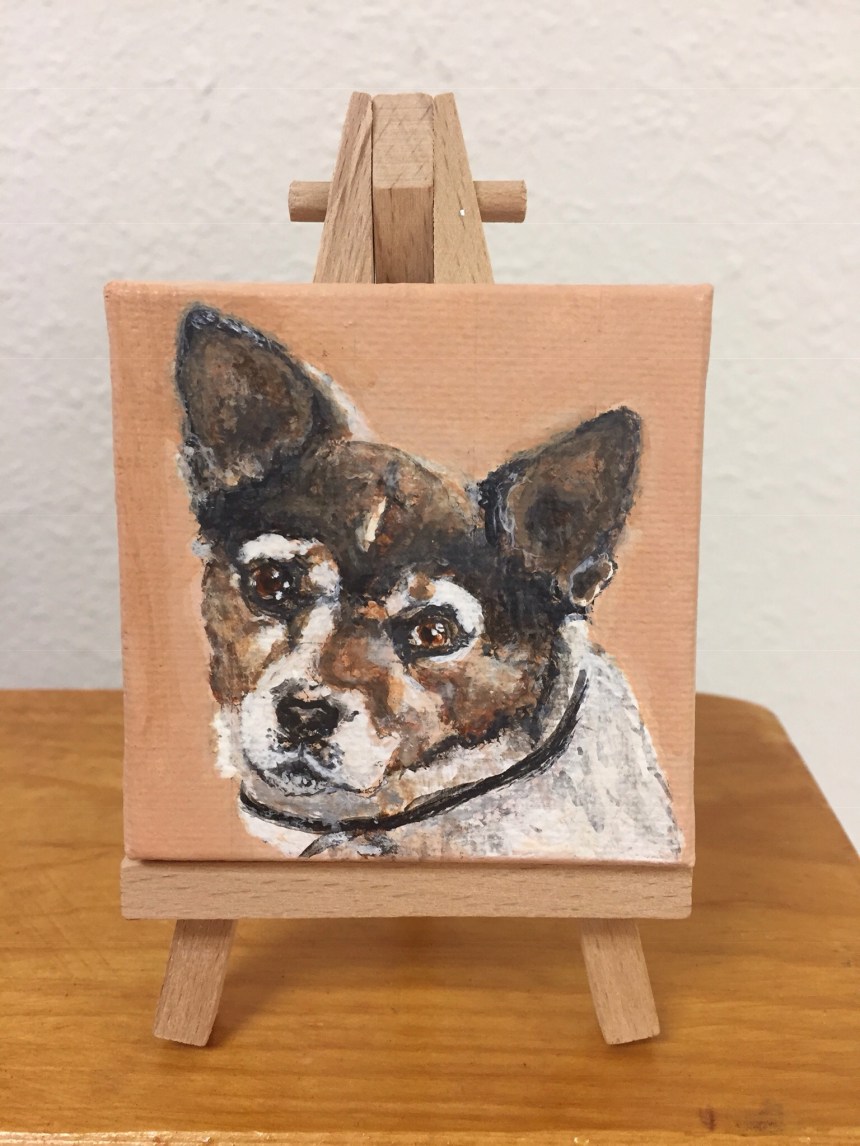 Little Asti was my brother Stan’s dog; she crossed the Rainbow Bridge last summer. Stan said she was the best dog ever! Acrylic on canvas, measures about 3″ X 3″, easel included, finished with a UV spray. Having to say goodbye hurts so much.