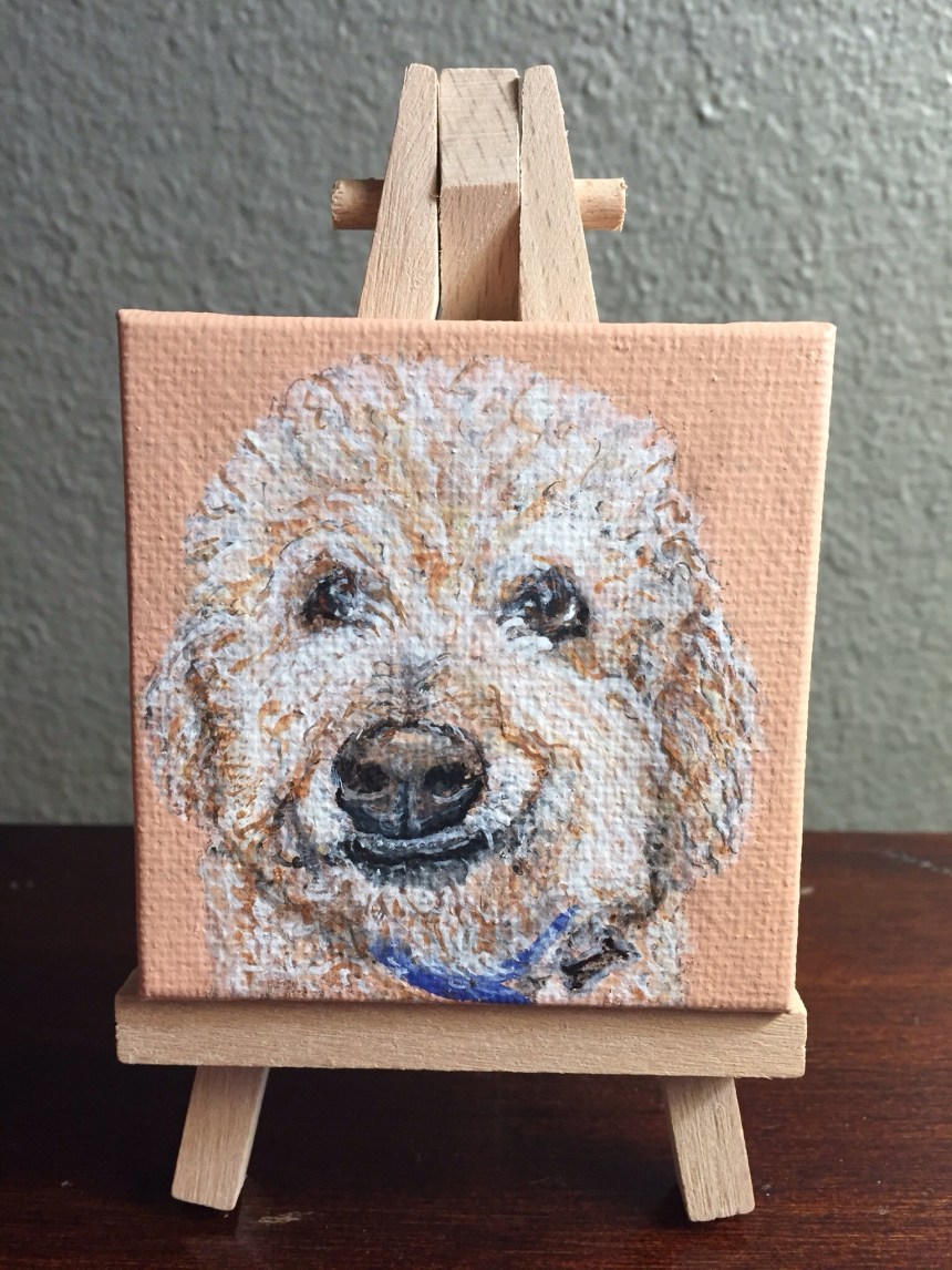And then, Peggy asked me to paint another one of her family’s puppers, Miss Dixie. This looks like she is smiling! Acrylic on canvas, easel included, measures approximately 3″ X 3″, finished with UV protectant.