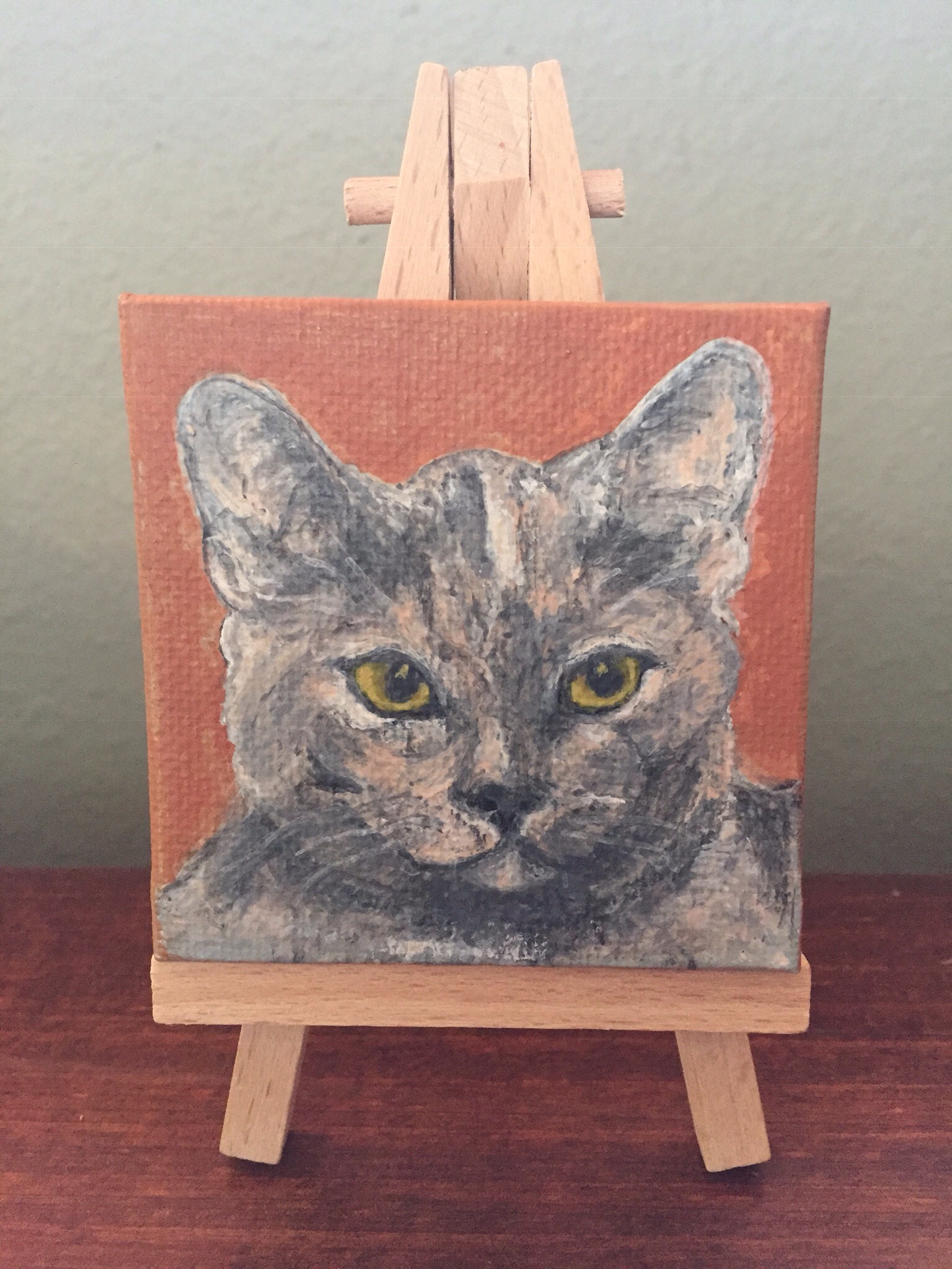 Another PEO sister, Natalie, asked me to paint this memory portrait of her husband’s beloved feline, Mbalala, a Zimbabwe word for butterfly. Mbala, for short, pronounced Bahla, is a Lilac Tortoiseshell Dilute. Oh, what pretty coloring! Acrylic on canvas, easel included, measures 3″ X 3″, finished with UV protectant.