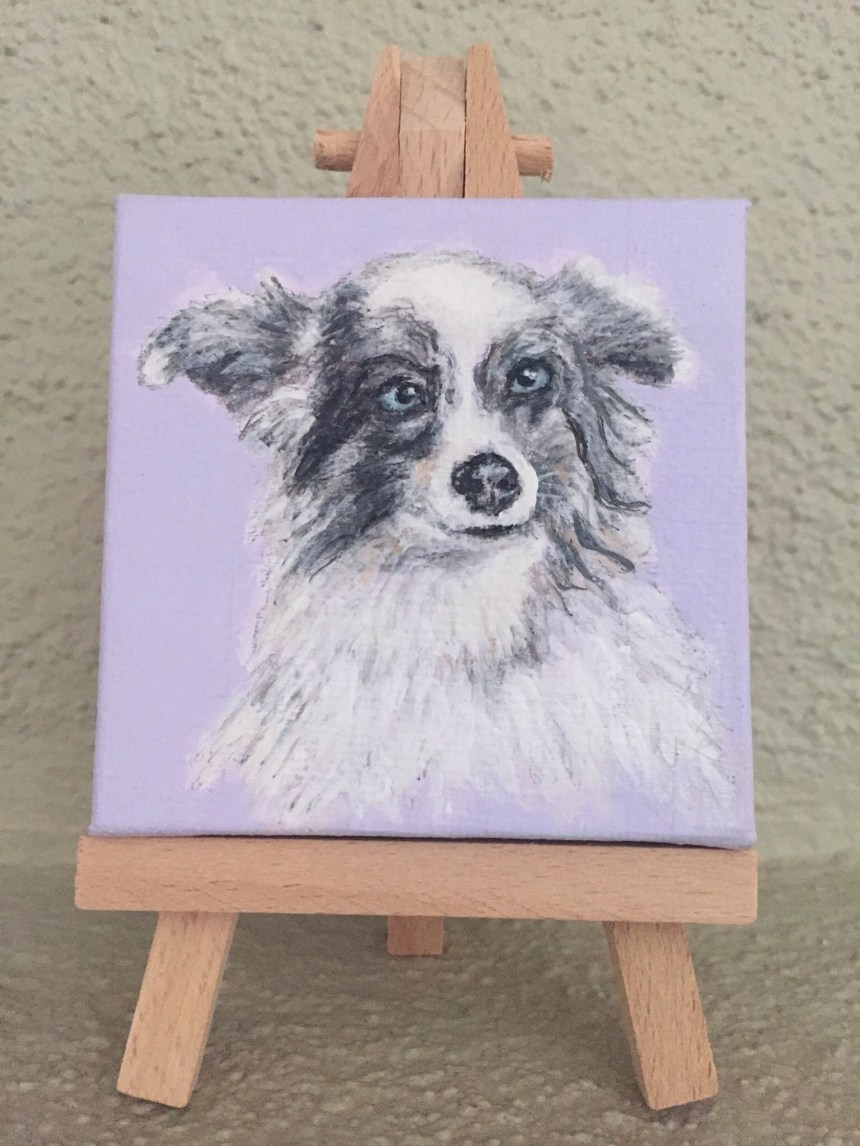 Lucky, Hermosa Beach, CA; Zoe, Santa Fe, NM; and Bonnie, Santa Fe, NM (bottom, middle, top in reverse order). Acrylic on canvas, includes easel, measures approx. 3″ X 3″, UV protectant applied. Commissions delightfully accepted!
