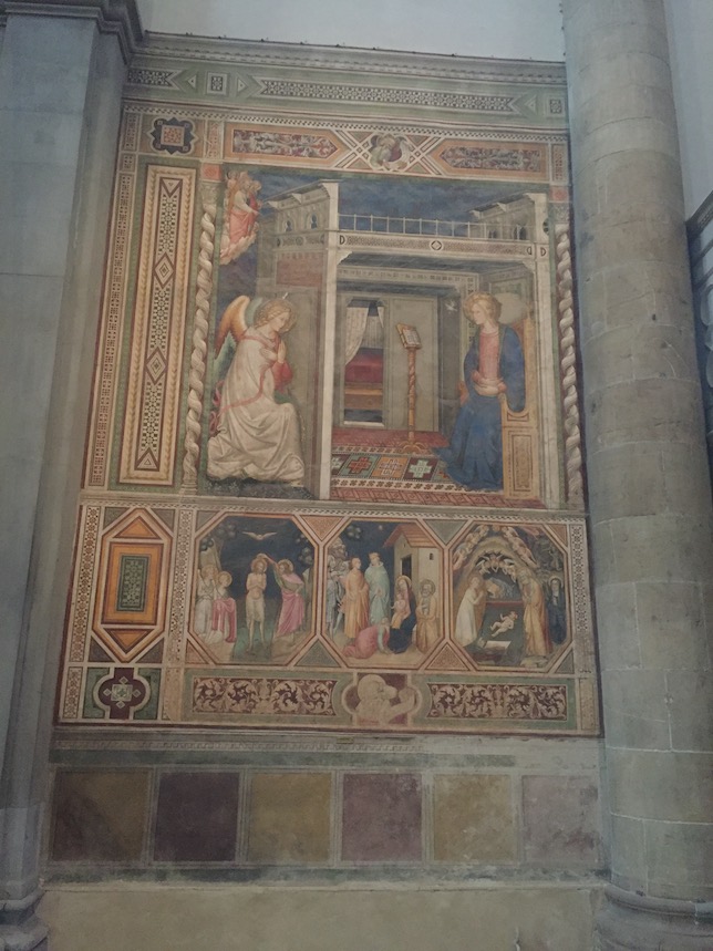 Yesterday on The Epiphany, as if magically, Memories of Italy popped up on my iPad! Photos taken at Santa Maria Novella in Florence accompanied by a brief musical score revealed an image. What synchronicity—a fresco of The Annunciation by Pietro di Miniato (1366-1490), and Lo and Behold, in the bottom portion of the fresco is a cutaway of the Magi.