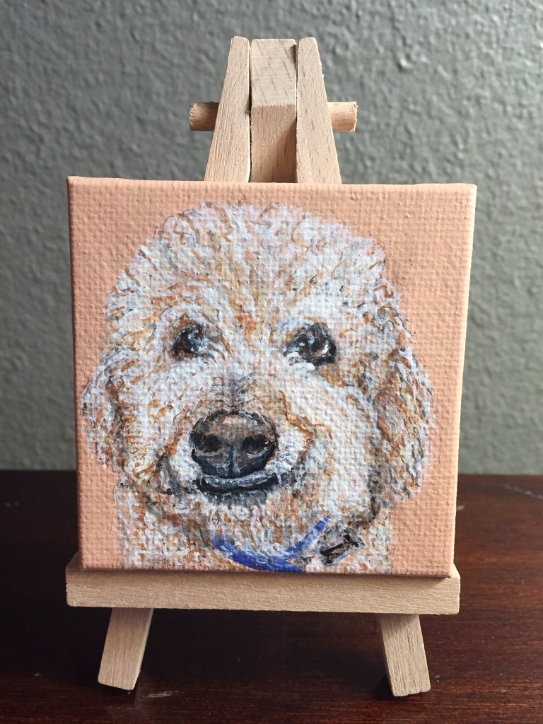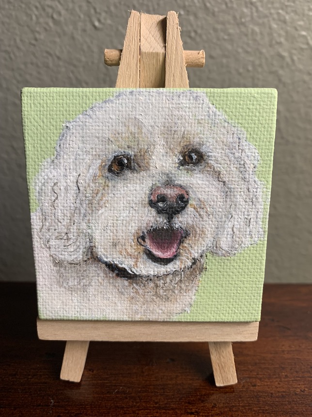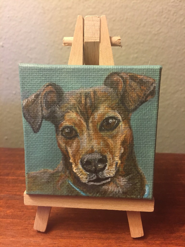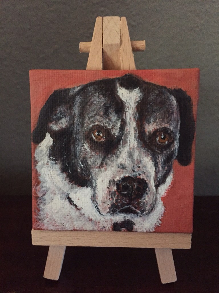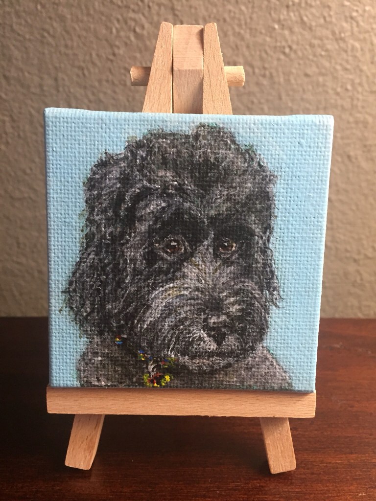 Image: Pet Portrait Miniature, Harley. Acrylic on Canvas, 3″x3″, Easel Included. Kimberly B. Gray, Santa Fe, NM.