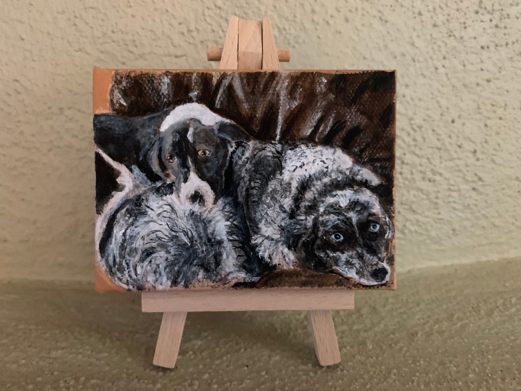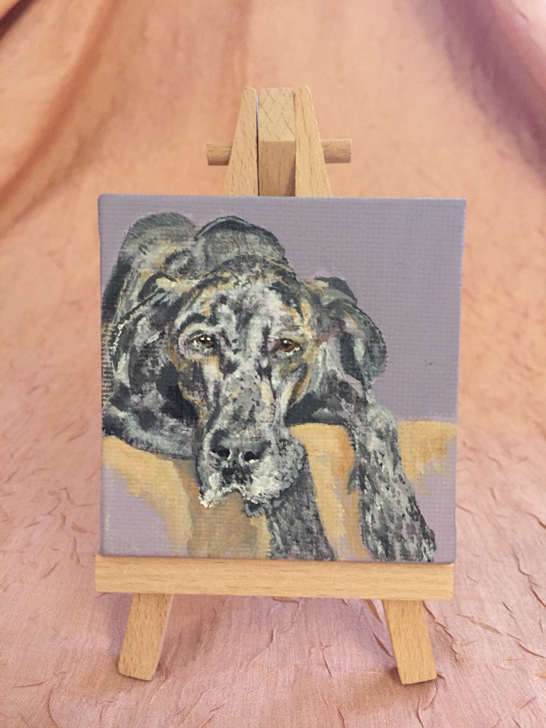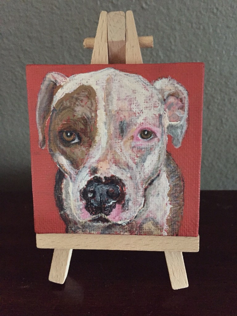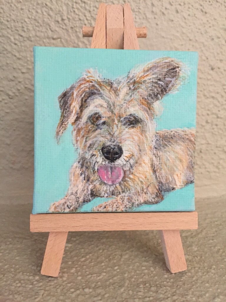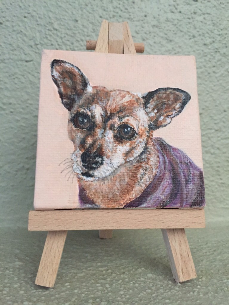 Image: Pet Portrait Miniature, Harley. Acrylic on Canvas, 3″x3″, Easel Included. Kimberly B. Gray, Santa Fe, NM.