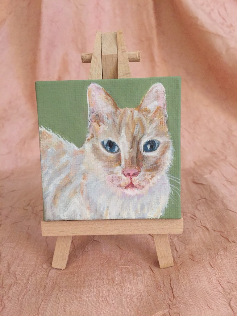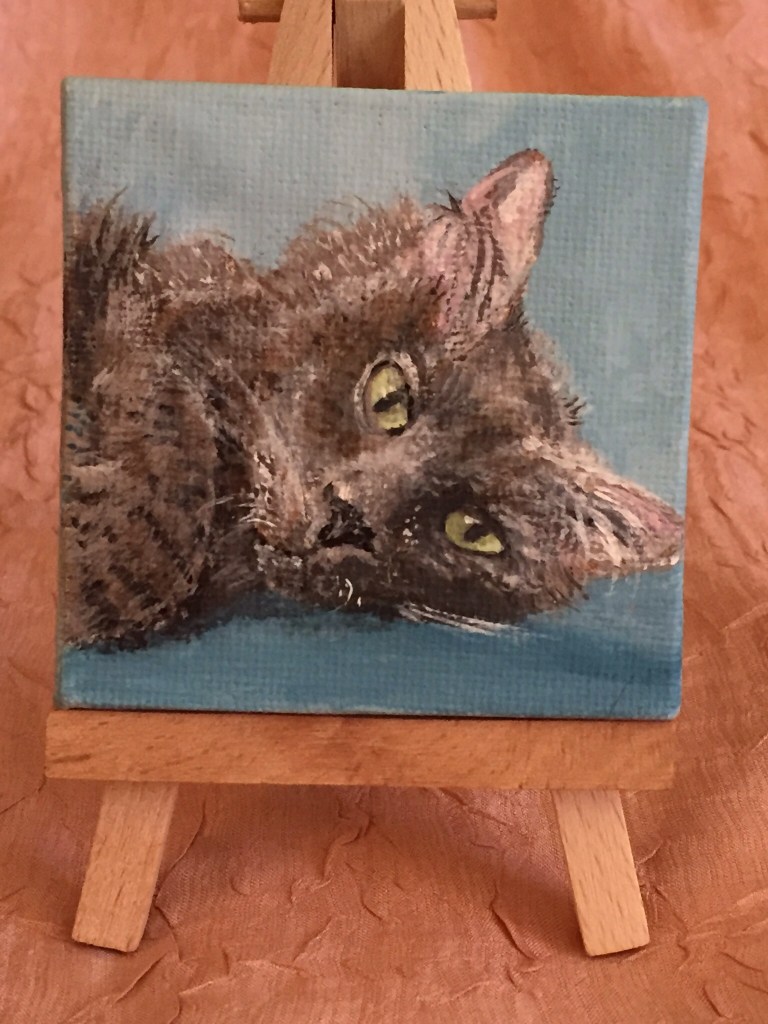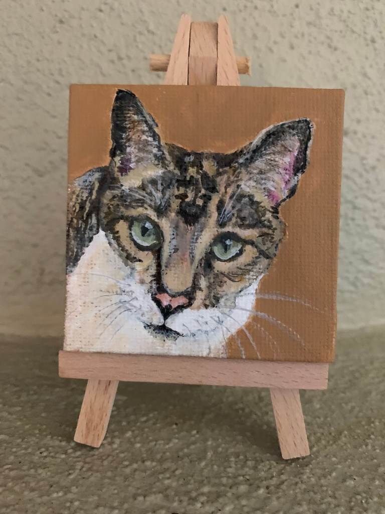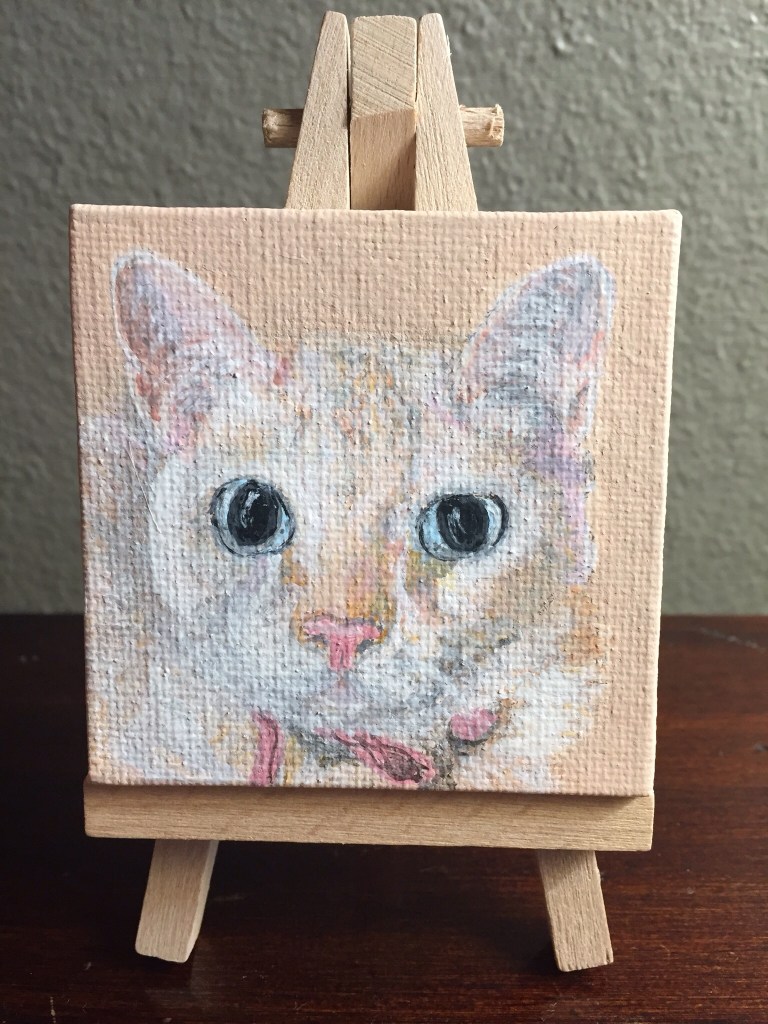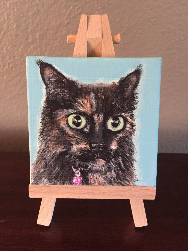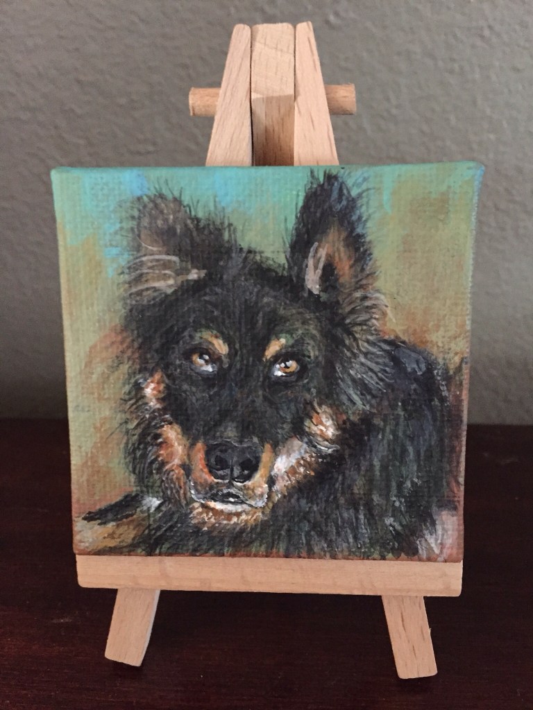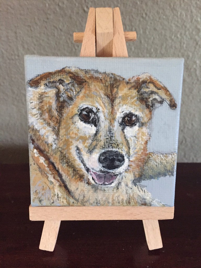 Image: Haven, Pet Portrait Miniature. Acrylic on Canvas, 3″x3″, Easel Included. Kimberly B. Gray, Santa Fe, NM.