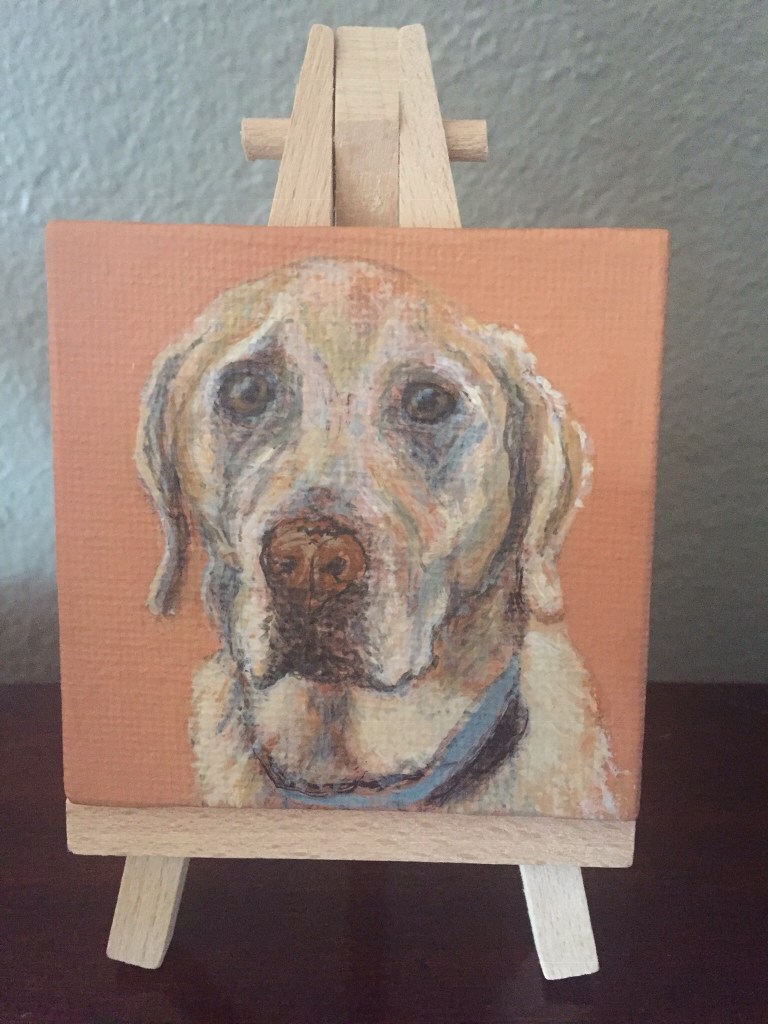 Image: Riley, Pet Portrait Miniature. Acrylic on Canvas, 3″x3″, Easel Included. Kimberly B. Gray, Santa Fe, NM.